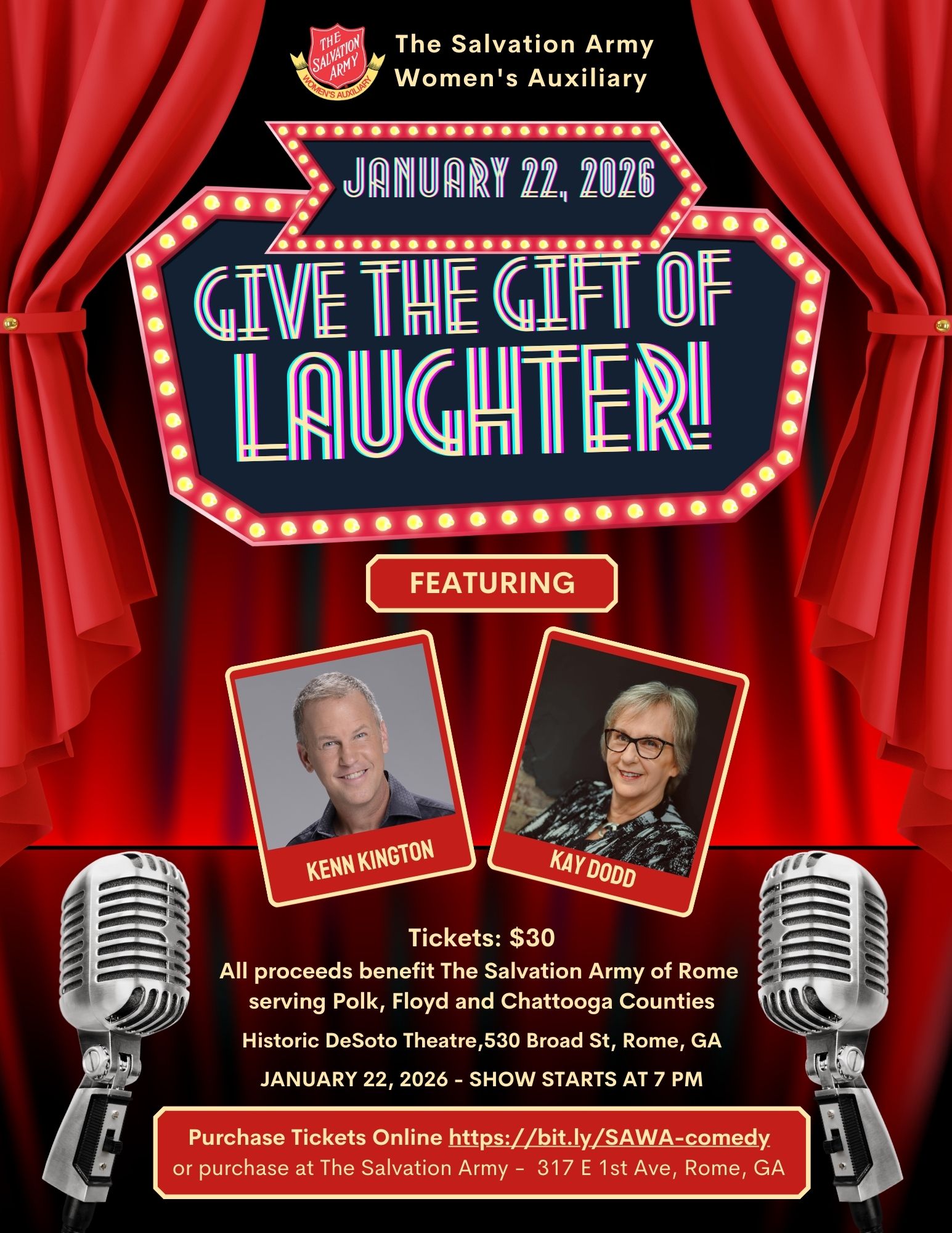 Come enjoy a one-night-only evening of clean comedy and laughter at “The Gift of Laughter” on January 22, 2026, at 7:00 PM at the historic DeSoto Theatre in Rome, Georgia, featuring comedians Kenn Kington and Kay Dodd. This fun night out is a wonderful way to give an experience instead of “more stuff,” all while supporting the life-changing work of The Salvation Army of Rome through the efforts of The Salvation Army Women’s Auxiliary.