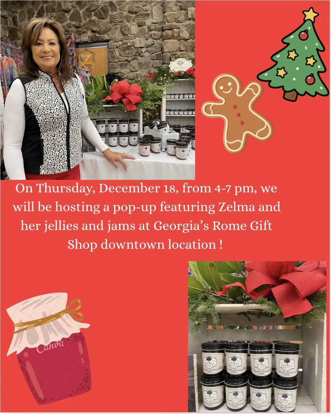 On Thursday December 18 from 4-7pm, we will be hosting a pop-up featuring Zelma and her jellies and jams at Georgia’s Rome Gift Shop downtown location.